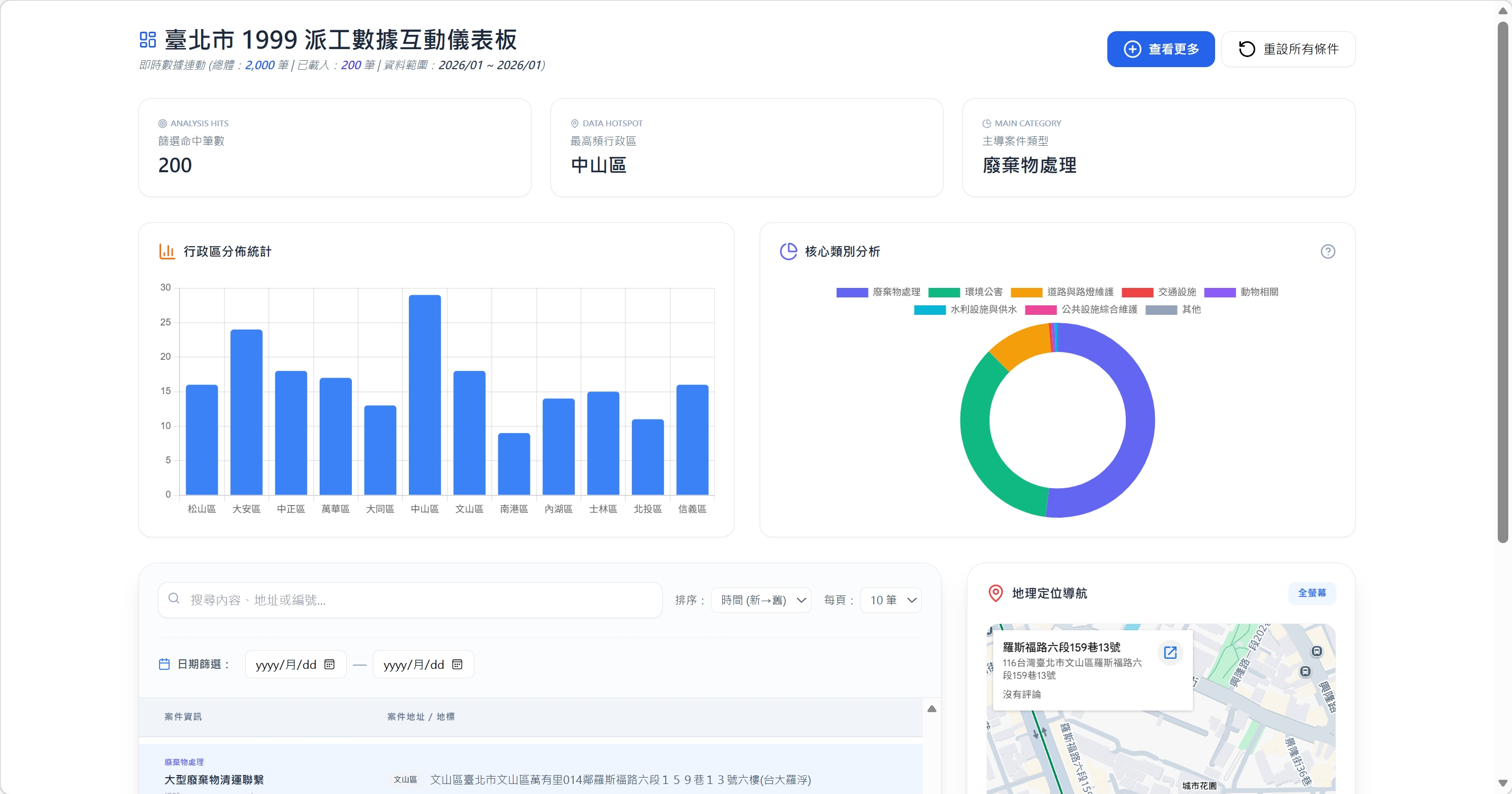 這是一個數據分析儀表板,透過解析臺北市政府官方 API,提供即時的數據視覺化功能,便於瞭解當前市政需求趨勢。並提供互動式操作介面,增強使用者體驗。